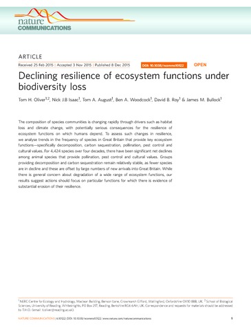 Oliver, T. H. ORCID: https://orcid.org/0000-0002-4169-7313, Isaac, N. J. B., August, T. A., Woodcock, B. A., Roy, D. B. and Bullock, J. M.