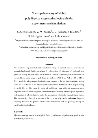 Ruiz-López, J. A., Wang, Z. W., Fernández-Toledano, J. C., Hidalgo-Alvarez, R. and de Vicente, J. (2016) Start-up rheometry of highly polydisperse magnetorheological fluids: experiments and simulations. Rheologica Acta, 55 (3). pp. 245-256. ISSN 1435-1528 doi: 10.1007/s00397-016-0914-y