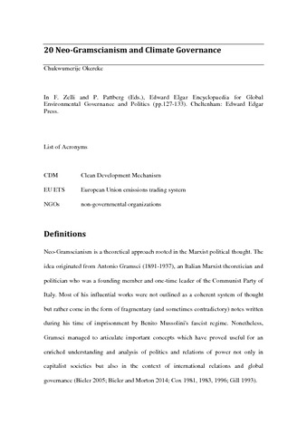Okereke, C. (2015) Neo-Gramscianism. In: Pattberg, P. H. and Zelli, F. (eds.) Edward Elgar Encyclopaedia for Global Environmental Governance and Politics. Edward Edgar Press, Cheltenham, pp. 127-133. ISBN 9781782545781