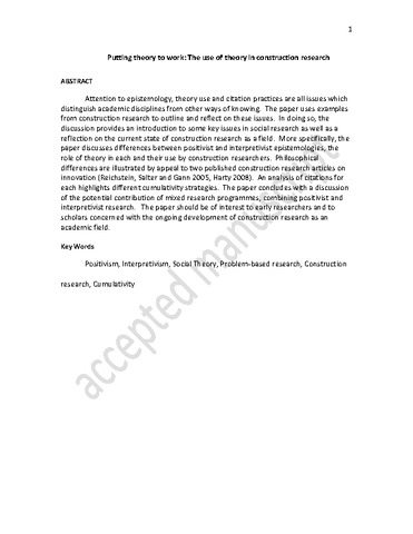 Attention to epistemology, theory use and citation practices are all issues which distinguish academic disciplines from other ways of knowing. Examples from construction research are used to outline and reflect on these issues. In doing so, the discussion provides an introduction to some key issues in social research as well as a reflection on the current state of construction research as a field. More specifically, differences between positivist and interpretivist epistemologies, the role of theory in each and their use by construction researchers are discussed. Philosophical differences are illustrated by appeal to two published construction research articles by Reichstein et al. and Harty on innovation (Reichstein, Salter and Gann, 2005; Harty, 2008). An analysis of citations for each highlights different cumulativity strategies. The potential contribution of mixed research programmes, combining positivist and interpretivist research, is evaluated. The paper should be of interest to early researchers and to scholars concerned with the ongoing development of construction research as an academic field.