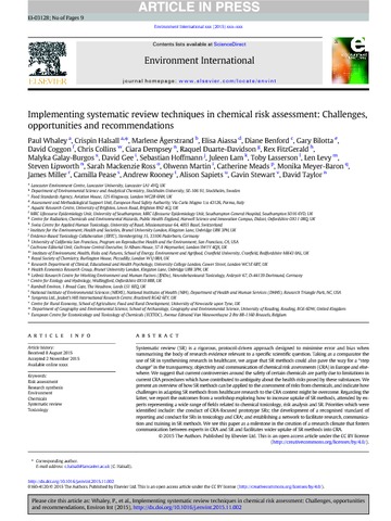 Whaley, P., Halsall, C., Ågerstrand, M., Aiassa, E., Benford, D., Bilotta, G., Coggon, D., Collins, C., Dempsey, C., Duarte-Davidson, R., FitzGerald, R., Galay-Burgos, M., Gee, D., Hoffmann, S., Lam, J., Lasserson, T., Levy, L., Lipworth, S., Ross, S. M., Martin, O., Meads, C., Meyer-Baron, M., Miller, J., Pease, C., Rooney, A., Sapiets, A., Stewart, G. and Taylor, D. (2015) Implementing systematic review techniques in chemical risk assessment: challenges, opportunities and recommendations. Environment International. ISSN 0160-4120 doi: 10.1016/j.envint.2015.11.002
