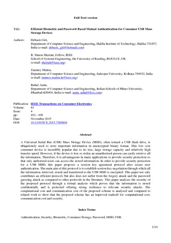 Efficient biometric and password based mutual authentication for consumer USB mass storage devices.
