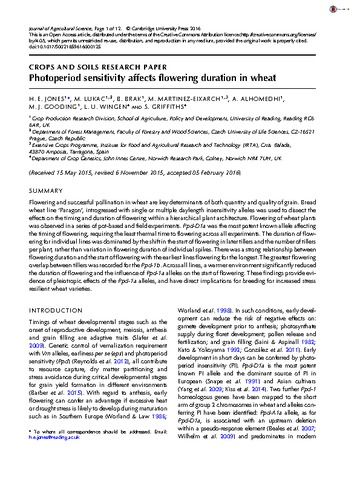 Jones, H. E., Lukac, M. orcid id iconORCID: https://orcid.org/0000-0002-8535-6334, Brak, B., Martinez Eixarch, M., Alhomedhi, A., Gooding, M. J., Wingen, L. U. and Griffiths, S. (2017) Photoperiod sensitivity affects flowering duration in wheat. Journal of Agricultural Science, 155 (1). pp. 32-43. ISSN 0021-8596 doi: 10.1017/S0021859616000125