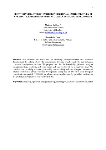 Belitski, M. and Desai, S. (2016) Creativity, entrepreneurship and economic development: city-level evidence on creativity spillover of entrepreneurship. Journal of Technology Transfer, 41 (6). pp. 1354-1376. ISSN 1573-7047 doi: 10.1007/s10961-015-9446-3