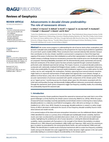 Bellucci, A., Haarsma, R., Bellouin, N. orcid id iconORCID: https://orcid.org/0000-0003-2109-9559, Booth, B., Cagnazzo, C., van den Hurk, B., Keenlyside, N., Koenigk, T., Massonet, F., Materia, S. and Weiss, M. (2015) Advancements in decadal climate predictability: the role of nonoceanic drivers. Reviews of Geophysics, 53 (2). pp. 165-202. ISSN 8755-1209 doi: 10.1002/2014RG000473