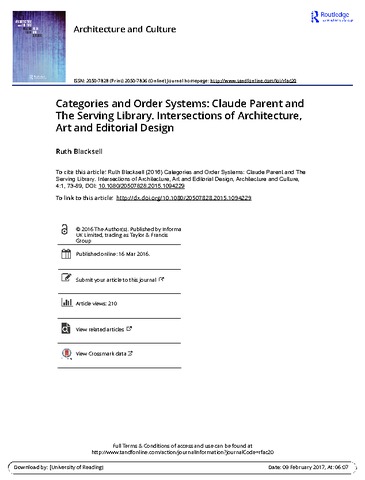 Blacksell, R. E. (2016) Categories & order systems: Claude Parent and The Serving Library. Intersections of architecture, art and editorial design. Architecture and Culture, 4 (1). pp. 73-89. ISSN 2050-7836 doi: 10.1080/20507828.2015.1094229