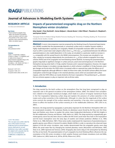 Sandu, I., Bechtold, P., Beljaars, A., Bozzo, A., Pithan, F., Shepherd, T. G. orcid id iconORCID: https://orcid.org/0000-0002-6631-9968 and Zadra, A. (2016) Impacts of parameterized orographic drag on the Northern Hemisphere winter circulation. Journal of Advances in Modeling Earth Systems, 8 (1). pp. 196-211. ISSN 1942-2466 doi: 10.1002/2015MS000564