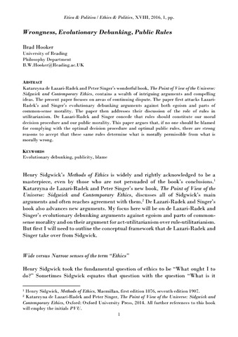 Hooker, B. (2016) Wrongness, evolutionary debunking, public rules. Etica and Politica, 18 (1). pp. 135-149. ISSN 1825-5167