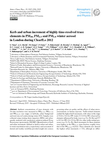 Kerb and urban increment of highly time-resolved trace elements in PM10, PM2.5 and PM1.0 winter aerosol in London during ClearfLo 2012