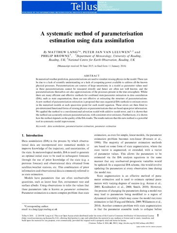 Lang, M. orcid id iconORCID: https://orcid.org/0000-0002-1904-3700, Van Leeuwen, P. J. and Browne, P. (2016) A systematic method of parameterisation estimation using data assimilation. Tellus A: Dynamic Meteorology and Oceanography, 68 (1). 29012. ISSN 1600-0870 doi: 10.3402/tellusa.v68.29012