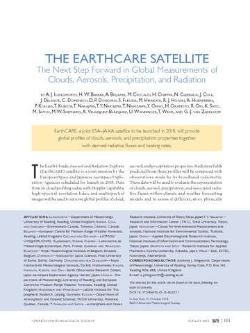 Illingworth, A. J. orcid id iconORCID: https://orcid.org/0000-0002-5774-8410, Barker, H. W., Beljaars, A., Ceccaldi, M., Chepfer, H., Clerbaux, N., Cole, J., Delanoë, J., Domenech, C., Donovan, D. P., Fukuda, S., Hirakata, M., Hogan, R. J. orcid id iconORCID: https://orcid.org/0000-0002-3180-5157, Huenerbein, A., Kollias, P., Kubota, T., Nakajima, T., Nakajima, T. Y., Nishizawa, T., Ohno, Y., Okamoto, H., Oki, R., Sato, K., Satoh, M., Shephard, M. W., Velázquez-Blázquez, A., Wandinger, U., Wehr, T. and van Zadelhoff, G.-J. (2015) The EarthCARE satellite: the next step forward in global measurements of clouds, aerosols, precipitation, and radiation. Bulletin of the American Meteorological Society, 96 (8). pp. 1311-1332. ISSN 1520-0477 doi: 10.1175/BAMS-D-12-00227.1