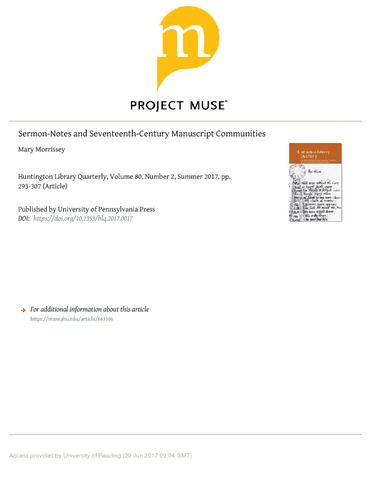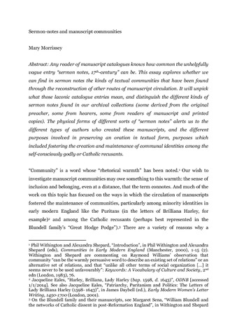 Any reader of manuscript catalogues knows how common the unhelpfully vague entry “sermon notes, 17th-century” can be. This essay explores whether we can find in sermon notes the kinds of textual communities that have been found through the reconstruction of other routes of manuscript circulation. It will unpick what those laconic catalogue entries mean, and distinguish the different kinds of sermon notes found in our archival collections (some derived from the original preacher, some from hearers, some from readers of manuscript and printed copies). The physical forms of different sorts of “sermon notes” alerts us to the different types of authors who created these manuscripts, and the different purposes involved in preserving an oration in textual form, purposes which included fostering the creation and maintenance of communal identities among the self-consciously godly or Catholic recusants.