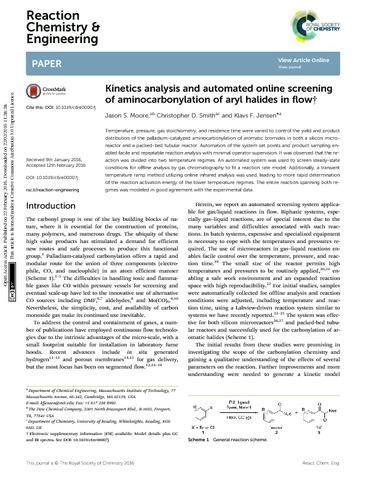 Temperature, pressure, gas stoichiometry, and residence time were varied to control the yield and product distribution of the palladium-catalyzed aminocarbonylation of aromatic bromides in both a silicon microreactor and a packed-bed tubular reactor. Automation of the system set points and product sampling enabled facile and repeatable reaction analysis with minimal operator supervision. It was observed that the reaction was divided into two temperature regimes. An automated system was used to screen steady-state conditions for offline analysis by gas chromatography to fit a reaction rate model. Additionally, a transient temperature ramp method utilizing online infrared analysis was used, leading to more rapid determination of the reaction activation energy of the lower temperature regimes. The entire reaction spanning both regimes was modeled in good agreement with the experimental data.