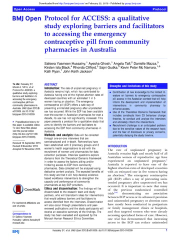 Hussainy, S. Y., Ghosh, A., Taft, A., Mazza, D., Black, K. I., Clifford, R., Gudka, S., Mc Namara, K. P., Ryan, K. and Jackson, J. K. (2015) Protocol for ACCESS: a qualitative study exploring barriers and facilitators to accessing the emergency contraceptive pill from community pharmacies in Australia. BMJ Open, 5 (12). e010009. ISSN 2044-6055 doi: 10.1136/bmjopen-2015-010009