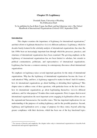 This chapter examines the importance of legitimacy for international organizations, and their efforts to legitimate themselves vis-à-vis different audiences. Legitimacy, which for decades barely featured in the scholarly analysis of international organizations, has since the late 1990s been an increasingly important lens through which the processes, practices, and structures of international organizations have been examined. The chapter makes three main arguments. First, it argues that in most international organizations the most important actors engaging in legitimation efforts are not the supranational bureaucracies, but member states. This has important implications for our understanding of the purposes of seeking legitimacy, and for the possible practices. Second, legitimacy and legitimation serve a range of purposes for these states, beyond achieving greater compliance with their decisions, which has been one of the key functional logics highlighted for legitimacy in the literature. Instead, legitimacy is frequently sought to exclude outsiders from the functional or territorial domains affected by an international organization’s authority, or to maintain external material and political support for existing arrangements. Third, one of the most prominent legitimation efforts, institutional reforms, often prioritizes form over function, signalling to important and powerful audiences to encourage their continued material and political support. To advance these arguments, the chapter is divided into four sections. The first develops the concept of legitimacy and its application to international organizations, and then asks why their legitimacy has become such an important intellectual and political concern in recent years. The second part will look in more detail at the legitimation practices of international organizations, focusing on who engages in these practices, who the key audiences are, and how legitimation claims are advanced. The third section will look in more detail at one of the most common forms of legitimation – institutional reform – through the lens of two such reforms in international organizations: efforts towards greater interoperability in NATO, and the establishment of the African Peace and Security Architecture in the African Union (AU). The chapter will conclude with some reflections of the contribution that a legitimacy perspective has made to our understanding of the practices of international organizations.