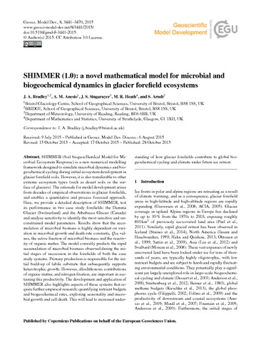 Bradley, J. A., Anesio, A. M., Singarayer, J. S., Heath, M. R. and Arndt, S. (2015) SHIMMER (1.0): a novel mathematical model for microbial and biogeochemical dynamics in glacier forefield ecosystems. Geoscientific Model Development, 8 (10). pp. 3441-3470. ISSN 1991-9603 doi: 10.5194/gmd-8-3441-2015