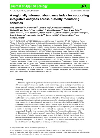 Schmucki, R., Pe'er, G., Roy, D. B., Stefanescu, C., Van Swaay, C. A.M., Oliver, T. H. orcid id iconORCID: https://orcid.org/0000-0002-4169-7313, Kuussaari, M., Van Strien, A. J., Ries, L., Settele, J., Musche, M., Carnicer, J., Schweiger, O., Brereton, T. M., Harpke, A., Heliölä, J., Kühn, E. and Julliard, R. (2016) A regionally informed abundance index for supporting integrative analyses across butterfly monitoring schemes. Journal of Applied Ecology, 53 (2). pp. 501-510. ISSN 0021-8901 doi: 10.1111/1365-2664.12561