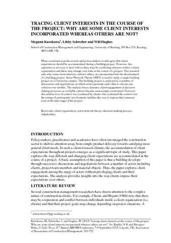 Many construction professionals and policy-makers would agree that client expectations should be accommodated during a building project. However, this aspiration is not easy to deal with as there may be conflicting interests within a client organization and these may change over time in the course of a project. This research asks why some client interests, and not others, are incorporated into the development of a building project. Actor-Network Theory (ANT) is used to study a single building project on a University campus. The building project is analysed as a number of discussions and negotiations, in which actors persuade each other to choose one solution over another. The analysis traces dynamic client engagement in decision-making processes as available options became increasingly constrained. However, this relative loss of control was countered by clients who continued the control over the timing of participants' involvement, and thus the way to impose their interests even at the later stage of the project.