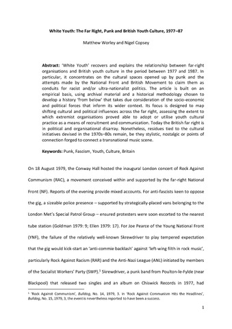 ‘White Youth’ recovers and explains the relationship between far-right organisations and British youth culture in the period between 1977 and 1987. In particular, it concentrates on the cultural spaces opened up by punk and the attempts made by the National Front and British Movement to claim them as conduits for racist and/or ultra-nationalist politics. The article is built on an empirical basis, using archival material and a historical methodology chosen to develop a history ‘from below’ that takes due consideration of the socio-economic and political forces that inform its wider context. Its focus is designed to map shifting cultural and political influences across the far right, assessing the extent to which extremist organisations proved able to adopt or utilise youth cultural practice as a means of recruitment and communication. Today the British far right is in political and organisational disarray. Nonetheless, residues tied to the cultural initiatives devised in the 1970s–80s remain, be they stylistic, nostalgic or points of connection forged to connect a transnational music scene.