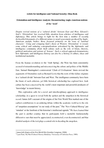 Rezk, D. (2016) Orientalism and intelligence analysis: deconstructing Anglo-American notions of the ‘Arab’. Intelligence and National Security, 31 (2). pp. 224-245. ISSN 1743-9019 doi: 10.1080/02684527.2014.949077