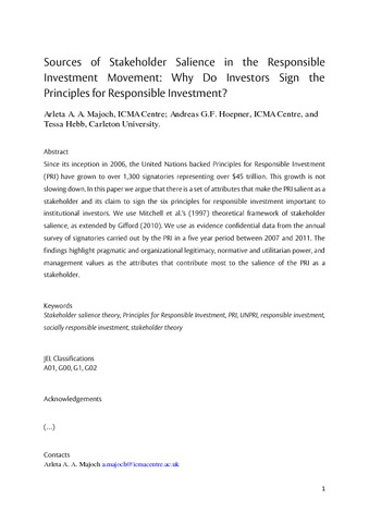 Majoch, A. A. A., Hoepner, A. G. F. and Hebb, T. (2017) Sources of stakeholder salience in the responsible investment movement: why do investors sign the Principles for Responsible Investment? Journal of Business Ethics, 140 (4). pp. 723-741. ISSN 1573-0697 doi: 10.1007/s10551-016-3057-2