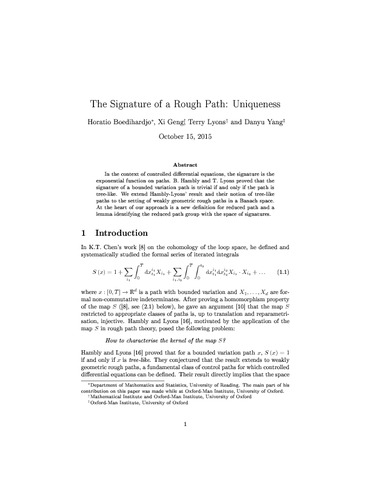 Boedihardjo, H., Geng, X., Lyons, T. and Yang, D. (2016) The signature of a rough path: uniqueness. Advances in Mathematics, 293. pp. 720-737. ISSN 1090-2082 doi: 10.1016/j.aim.2016.02.011