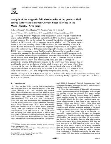 McGregor, S. L., Hughes, W. J., Arge, C. N. and Owens, M. J. orcid id iconORCID: https://orcid.org/0000-0003-2061-2453 (2008) Analysis of the magnetic field discontinuity at the potential field source surface and Schatten Current Sheet interface in the Wang–Sheeley–Arge model. Journal of Geophysical Research, 113 (A8). A08112. ISSN 0148-0227 doi: 10.1029/2007JA012330