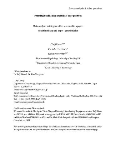 Ueno, T., Fastrich, G. and Murayama, K. (2016) Meta-analysis to integrate effect sizes within a paper: possible misuse and Type-1 error inflation. Journal of Experimental Psychology: General, 145 (5). pp. 643-654. ISSN 1939-2222 doi: 10.1037/xge0000159