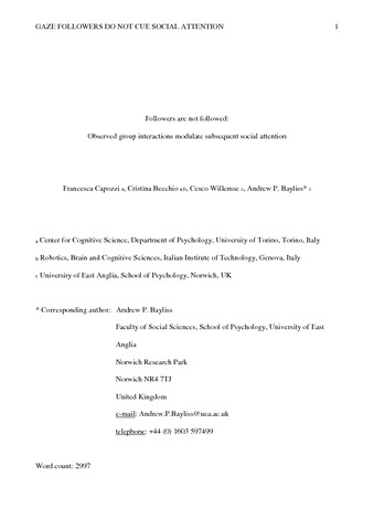Dalmaso, M., Edwards, S. G., & Bayliss, A. P. (2015). Re-Encountering individuals who previously engaged in joint gaze modulates subsequent gaze cueing. Journal of Experimental Psychology : Learning, Memory, and Cognition. http://doi.org/http://dx.doi.org/10.1037/xlm0000159