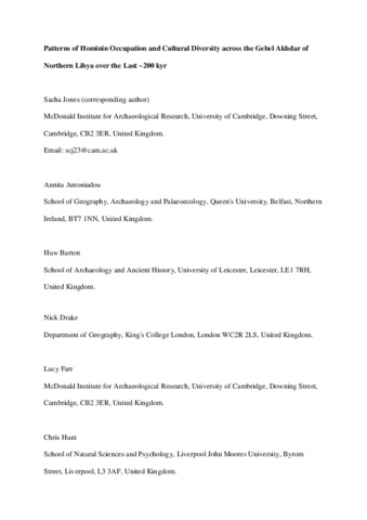 Jones, S., Antoniadou, A., Barton, H., Drake, N., Farr, L., Hunt, C., Inglis, R., Reynolds, T., White, K. and Barker, G. (2016) Patterns of hominin occupation and cultural diversity across the Gebel Akhdar of Northern Libya over the last ~200 kyr. In: Jones, S. C. and Stewart, B. A. (eds.) Africa from MIS 6-2: Population Dynamics and Paleoenvironments. Vertebrate Paleobiology and Paleoanthropology. Springer, Dordrecht, pp. 77-99. ISBN 9789401775205 doi: 10.1007/978-94-017-7520-5_5