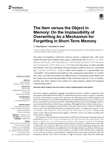Beaman, C. P. orcid id iconORCID: https://orcid.org/0000-0001-5124-242X and Jones, D. (2016) The item versus the object in memory: on the implausibility of overwriting as a mechanism for forgetting in short-term memory. Frontiers in Psychology, 7. 341. ISSN 1664-1078 doi: 10.3389/fpsyg.2016.00341