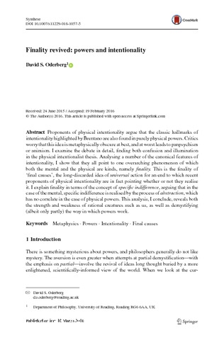 Proponents of physical intentionality argue that the classic hallmarks of intentionality highlighted by Brentano are also found in purely physical powers. Critics worry that this idea is metaphysically obscure at best, and at worst leads to panpsychism or animism. I examine the debate in detail, finding both confusion and illumination in the physical intentionalist thesis. Analysing a number of the canonical features of intentionality, I show that they all point to one overarching phenomenon of which both the mental and the physical are kinds, namely finality. This is the finality of ‘final causes’, the long-discarded idea of universal action for an end to which recent proponents of physical intentionality are in fact pointing whether or not they realise it. I explain finality in terms of the concept of specific indifference, arguing that in the case of the mental, specific indifference is realised by the process of abstraction, which has no correlate in the case of physical powers. This analysis, I conclude, reveals both the strength and weakness of rational creatures such as us, as well as demystifying (albeit only partly) the way in which powers work.