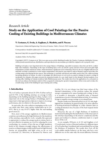 Costanzo, V., Evola, G., Gagliano, A., Marletta, L. and Nocera, F. (2013) Study on the application of cool paintings for the passive cooling of existing buildings in Mediterranean climates. Advances in Mechanical Engineering, 5. 413675. ISSN 1687-8132 doi: 10.1155/2013/413675