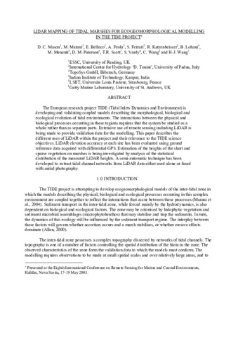 Mason, D. C. orcid id iconORCID: https://orcid.org/0000-0001-6092-6081, Marani, M., Belluco, E., Feola, A., Ferrari, S., Katzenbeisser, R., Lohani, B., Menenti, M., Paterson, D.M., Scott, T.R., Vardy, S., Wang, C. and Wang, H.-J. (2005) LiDAR mapping of tidal marshes for ecogeomorphological modelling in the TIDE project. In: Eighth International Conference on Remote Sensing for Marine and Coastal Environments, 17-19 May 2005, Halifax, Nova Scotia. (Unpublished)