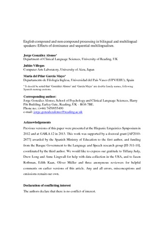 Gonzalez Alonso, J., Villegas, J. and García Mayo, M. d. P. (2016) English compound and non-compound processing in bilingual and multilingual speakers: effects of dominance and sequential multilingualism. Second Language Research, 32 (4). pp. 503-535. ISSN 1477-0326 doi: 10.1177/0267658316642819