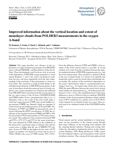 Desmons, M., Ferlay, N., Parol, F., Mcharek, L. and Vanbauce, C. (2013) Improved information about the vertical location and extent of monolayer clouds from POLDER3 measurements in the oxygen A-band. Atmospheric Measurement Techniques, 6 (8). pp. 2221-2238. ISSN 1867-8548 doi: 10.5194/amt-6-2221-2013