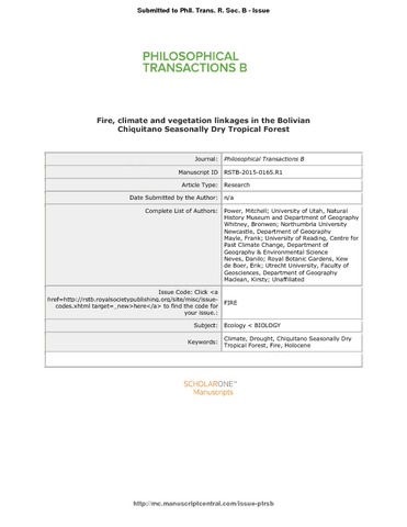Power, M. J., Whitney, B. S., Mayle, F. E. orcid id iconORCID: https://orcid.org/0000-0001-9208-0519, Neves, D. M., de Boer, E. J. and Maclean, K. S. (2016) Fire, climate and vegetation linkages in the Bolivian Chiquitano Seasonally Dry Tropical Forest. Philosophical Transactions of the Royal Society B: Biological Sciences, 371 (1696). 20150165. ISSN 0962-8436 doi: 10.1098/rstb.2015.0165