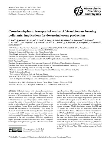 Real, E., Orlandi, E., Law, K.S., Fierli, F., Josset, D., Cairo, F., Schlager, H., Borrmann, S., Kunkel, D., Volk, M., McQuaid, J.B., Stewart, D. J., Lee, J., Lewis, A., Hopkins, J.R., Ravegnani, F., Ulanovski, A. and Liousse, C. (2010) Cross-hemispheric transport of Central African biomass burning pollutants: implications for downwind ozone production. Atmospheric Chemistry and Physics, 10 (6). pp. 3027-3046. ISSN 1680-7316 doi: 10.5194/acp-10-3027-2010