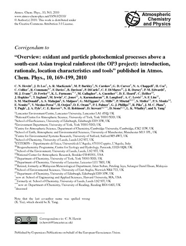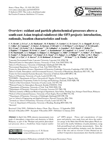 Hewitt, C.N., Lee, J.D., MacKenzie, A.R., Barkley, M.P., Carslaw, N., Carver, G.D., Chappell, N.A., Coe, H., Collier, C., Commane, R., Davies, F., Davison, B., DiCarlo, P., Di Marco, C.F., Dorsey, J.R., Edwards, P.M., Evans, M.J., Fowler, D., Furneaux, K.L., Gallagher, M., Guenther, A., Heard, D.E., Helfter, C., Hopkins, J., Ingham, T., Irwin, M., Jones, C., Karunaharan, A., Langford, B., Lewis, A.C., Lim, S.F., MacDonald, S.M., Mahajan, A.S., Malpass, S., McFiggans, G., Mills, G., Misztal, P., Moller, S., Monks, P.S., Nemitz, E., Nicolas-Perea, V., Oetjen, H., Oram, D.E., Palmer, P.I., Phillips, G.J., Pike, R., Plane, J.M.C., Pugh, T., Pyle, J.A., Reeves, C.E., Robinson, N.H., Stewart, D. J., Stone, D., Whalley, L.K. and Yang, X. (2010) Overview: oxidant and particle photochemical processes above a south-east Asian tropical rain forest (the OP3 project); introduction, rationale, location, characteristics and tools. Atmospheric Chemistry and Physics, 10 (1). pp. 169-199. ISSN 1680-7316 doi: 10.5194/acp-10-169-2010