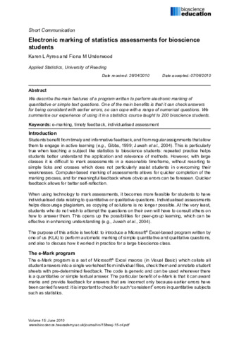 Ayres, K. L. and Underwood, F. M. (2010) Electronic marking of statistics assessments for bioscience students. Bioscience Education, 15. c4. ISSN 1479-7860 doi: 10.3108/beej.15.c4