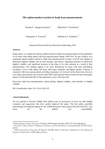 Anagnostopoulou, S. C., Ferentinou, A. C., Tsaousis, P. A. and Tsekrekos, A. E. (2018) The option market reaction to bank loan announcements. Journal of Financial Services Research, 53 (1). pp. 99-139. ISSN 1573-0735 doi: 10.1007/s10693-016-0243-4