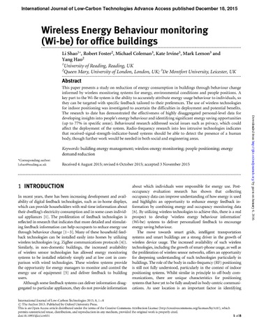 This paper presents a study on reduction of energy consumption in buildings through behaviour change informed by wireless monitoring systems for energy, environmental conditions and people positions. A key part to the Wi-Be system is the ability to accurately attribute energy usage behaviour to individuals, so they can be targeted with specific feedback tailored to their preferences. The use of wireless technologies for indoor positioning was investigated to ascertain the difficulties in deployment and potential benefits. The research to date has demonstrated the effectiveness of highly disaggregated personal-level data for developing insights into people’s energy behaviour and identifying significant energy saving opportunities (up to 77% in specific areas). Behavioural research addressed social issues such as privacy, which could affect the deployment of the system. Radio-frequency research into less intrusive technologies indicates that received-signal-strength-indicator-based systems should be able to detect the presence of a human body, though further work would be needed in both social and engineering areas.