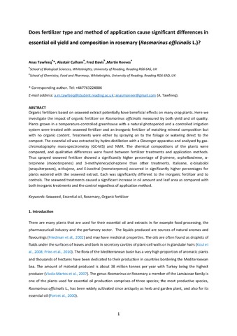 Tawfeeq, A., Culham, A. orcid id iconORCID: https://orcid.org/0000-0002-7440-0133, Davis, F. orcid id iconORCID: https://orcid.org/0000-0003-0462-872X and Reeves, M. (2016) Does fertilizer type and method of application cause significant differences in essential oil yield and composition in rosemary (Rosmarinus officinalis L.)? Industrial Crops and Products. ISSN 0926-6690 doi: 10.1016/j.indcrop.2016.03.026