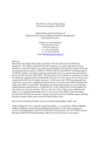 Raess, D. and Pontusson, J. (2015) The politics of fiscal policy during economic downturns, 1981-2010. European Journal of Political Research, 54 (1). pp. 1-22. ISSN 0304-4130 doi: 10.1111/1475-6765.12074
