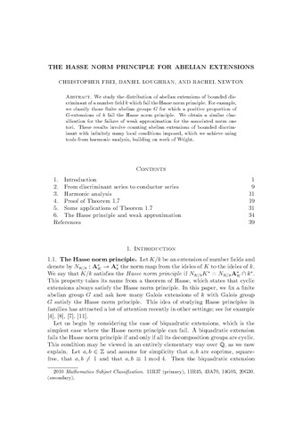 Frei, C., Loughran, D. and Newton, R. orcid id iconORCID: https://orcid.org/0000-0003-4925-635X (2018) The Hasse norm principle for abelian extensions. American Journal of Mathematics, 140 (6). pp. 1639-1685. ISSN 1080-6377 doi: 10.1353/ajm.2018.0048