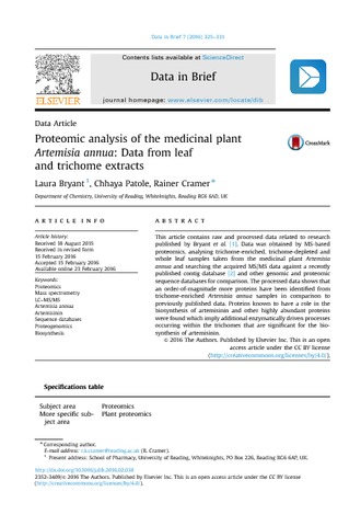 Proteomic analysis of the medicinal plant Artemisia annua: data from leaf and trichome extracts.