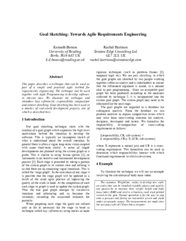 Boness, K. D. and Harrison, R. (2007) Goal sketching: towards agile requirements engineering. In: Second International Conference on Software Engineering Advances (ICSEA 2007), 25-31 Aug 2007, Cap Esterel, France, p. 71.
