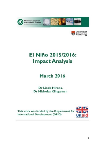 During the summer and autumn of 2015, El Niño conditions in the east and central Pacific strengthened, disrupting weather patterns throughout the tropics and into the mid-latitudes. For example, rainfall during the summer’s Indian monsoon was approximately 15% below normal. The continued strong El Niño conditions have the potential to trigger damaging impacts (e.g., droughts, famines, floods), particularly in less-developed tropical countries, which would require a swift and effective humanitarian response to mitigate damage to life and property (e.g., health, migration, infrastructure). This analysis uses key climatic variables (temperature, soil moisture and precipitation) as measures to monitor the ongoing risk of these potentially damaging impacts. The previous 2015-2016 El Niño Impact Analysis was based on observations over the past 35 years and produced Impact Tables showing the likelihood and severity of the impacts on temperature and rainfall by season. The current report is an extension of this work, providing information from observations and seasonal forecast models to give a more detailed outlook of the potential near-term impacts of the current El Niño conditions by region. This information has been added to the Impact Tables in the form of an ‘Observations and Outlook’ row. This consists of observational information for the past seasons of JJA 2015, SON 2015 and DJF 2015/2016, a detailed monthly outlook from 5 modeling centres for Mar 2016 and then longer-term seasonal forecast information from 2 modeling centres for the future seasons of AM 2016 and JJA 2016. The seasonal outlook information is an indication of the average likely conditions for that coming month (or season) and region and is not a definite prediction of weather impacts. This report has been produced by University of Reading for Evidence on Demand with the assistance of the UK Department for International Development (DFID) contracted through the Climate, Environment, Infrastructure and Livelihoods Professional Evidence and Applied Knowledge Services (CEIL PEAKS) programme, jointly managed by DAI (which incorporates HTSPE Limited) and IMC Worldwide Limited.