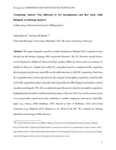 Kupisch, T. and Rothman, J. (2018) Terminology matters! Why difference is not incompleteness and how early child bilinguals are heritage speakers. International Journal of Bilingualism, 22 (5). pp. 564-582. ISSN 1756-6878 doi: 10.1177/1367006916654355