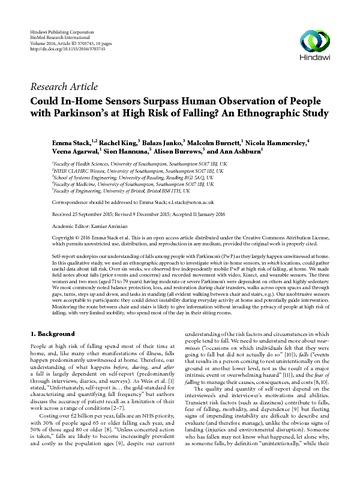 Stack, E., King, R., Janko, B., Burnett, M., Hammersley, N., Agarwal, V., Hannuna, S., Burrows, A. and Ashburn, A. (2016) Could in-home sensors surpass human observation of people with Parkinson’s at high risk of falling? An ethnographic study. BioMed research international, 2016. 3703745. ISSN 2314-6133 doi: 10.1155/2016/3703745